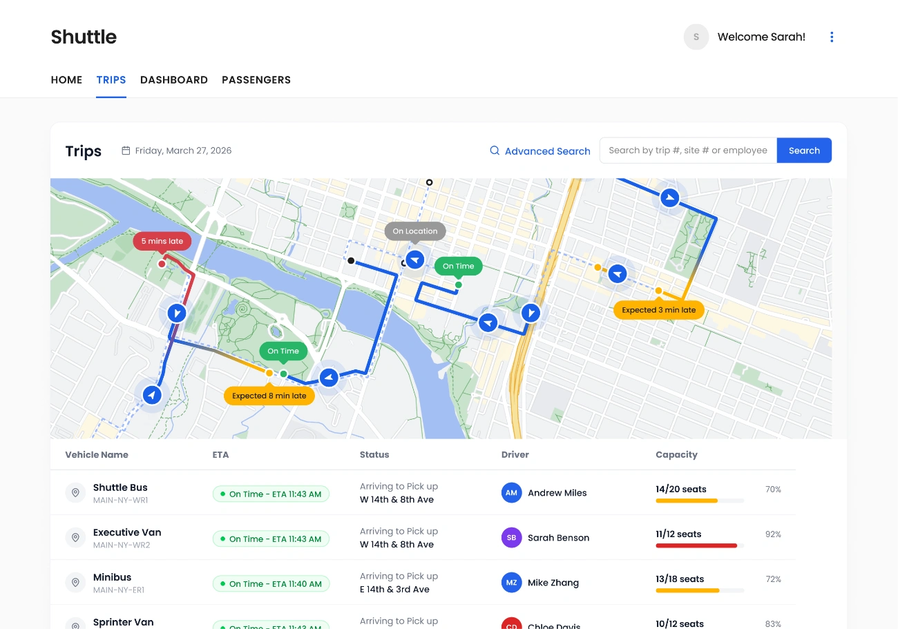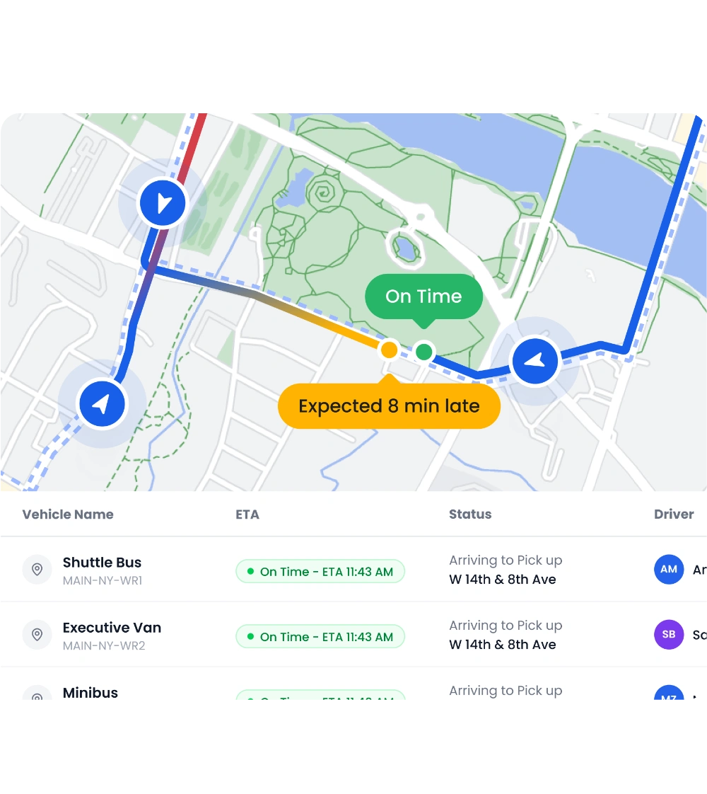 Build fixed schedules, continuous loops, event routes, or multi-stop runs — whatever your operation needs. Drivers and passengers each get their own real-time view.